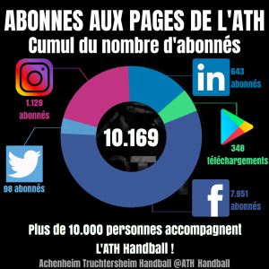 En avril 2020, Achenheim Truchtersheim Handball a franchi un cap symbolique en dépassant les 10.000 abonné(e)s dans sa fan base digitale (Facebook + Linkedin + Instagram + Twitter + Application ATH), ce qui fait de nous le 11ème club français de handball féminin le plus suivi !