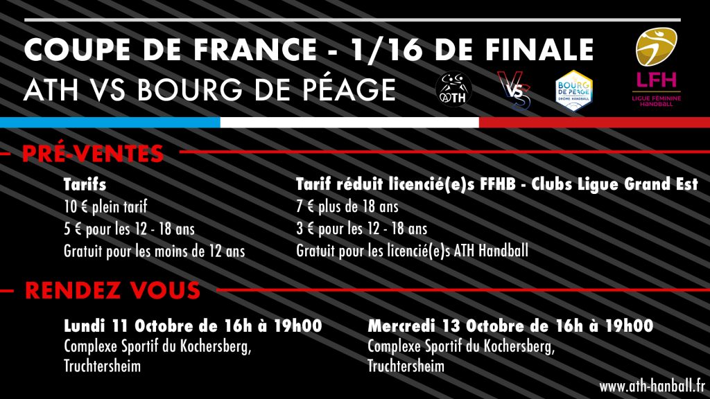 Afin de faciliter l’organisation et l’accès au Complexe Sportif du Kochersberg samedi 16 octobre 2021, le club de ATH Handball organise deux créneaux de pré-vente des billets :
