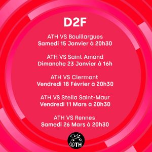 ll reste encore quatre journées à disputer avant d’arriver à la mi-parcours de ce championnat de D2. Après ce premier déplacement de l’année en Gironde, le plus long de la saison, l’ATH disputera deux matches d’affilée à domicile contre Bouillargues (samedi 15 janvier) et Saint-Amand (dimanche 23 janvier) avant de se rendre à Vaulx-en-Velin (samedi 5 février).